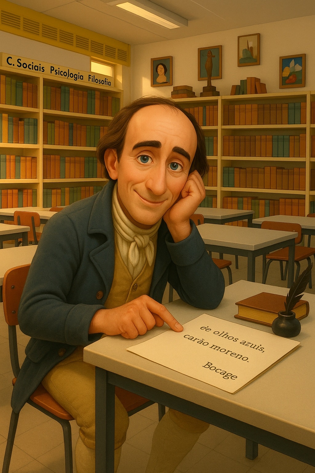15 de setembro de 2025 - "Magro, de olhos azuis, carão moreno | Bem servido de pés, meão na altura." Eis que Bocage visita a Biblioteca Escolar, no dia em que o concelho de Setúbal assinala o aniversário do nascimento do poeta sadino. Seja bem-vindo!