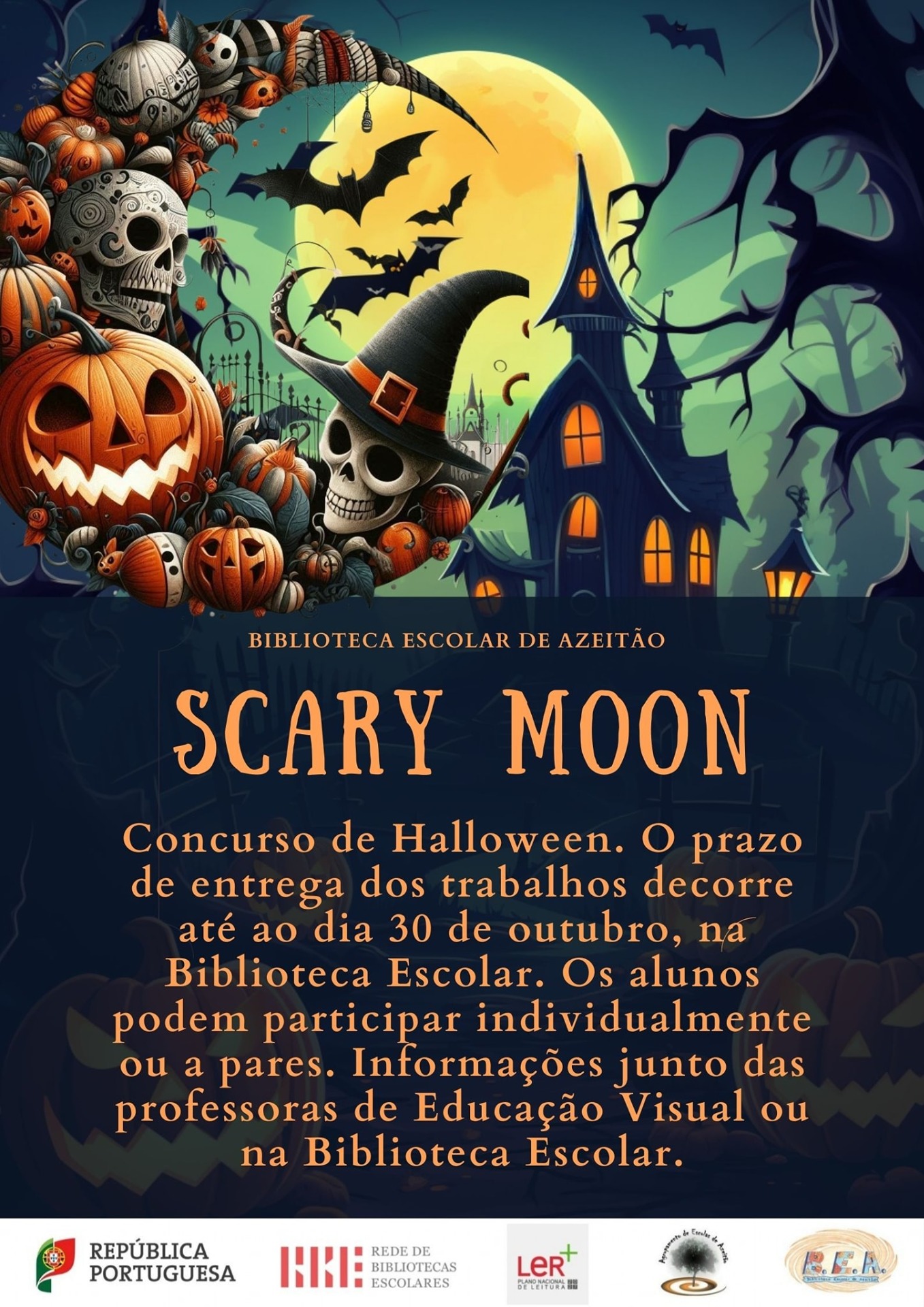 29 de setembro de 2025 - Como antes referimos, com a chegada do mês de outubro, chegam também os habituais concursos de Halloween na Biblioteca Escolar. Este ano, o tema é Scary Moon. Eis o regulamento. Até dia 30 de outubro, ficamos à espera da participação dos alunos, com a criatividade a que já estamos acostumados.
